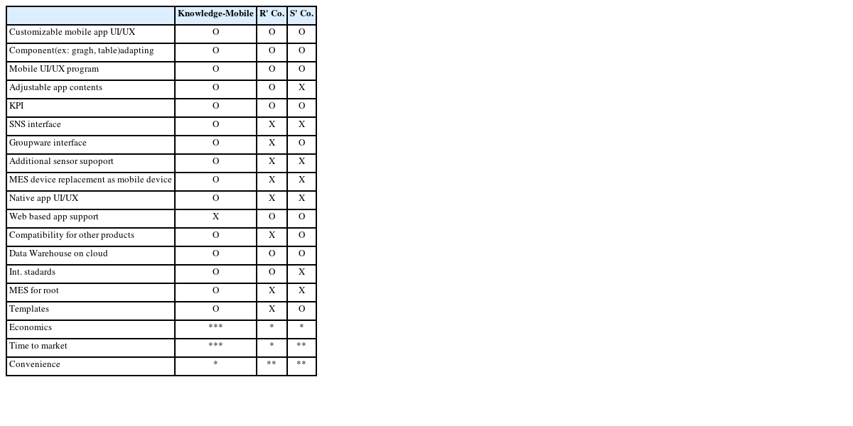 - 각 기업들의 모바일 기반의 생산정보화 서비스에 대한 자료 수집/분석 결과를 토대로 본 연구에서 제안하고자 하는 모바일 기반의 생산정보화시스템과의 비교표를 작성하였다.