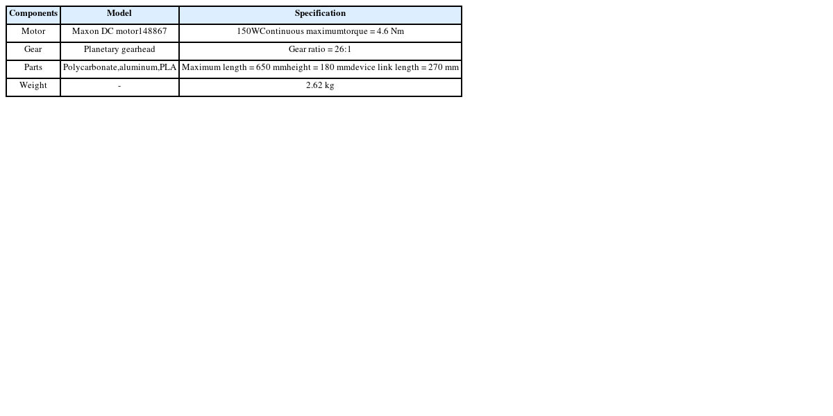 Table 2). 모터와 스프링이 병렬적으로 연결되어 있는 유연한 구조를 이용하여 기구 사용 중에 팔이 벽이나 물체에 부딪히더라도 외부로부터의 충격에 치명적이지 않도록 하였다.