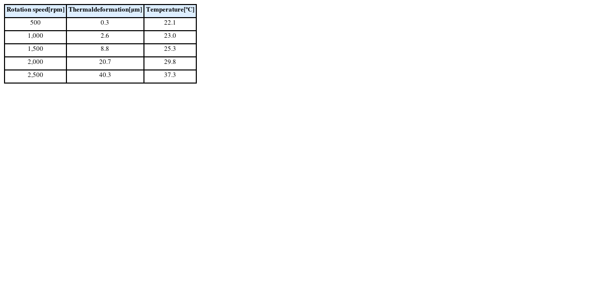 선회형 모듈의 회전에 따라 가공정밀도에 영향을 미치는 주요 부위의 발열범위를 파악하기 위하여, 회전속도를 500 rpm 부터 2,500 rpm까지 구간별로 500 rpm을 증가시켜 열해석을 수행하였다. 열해석은