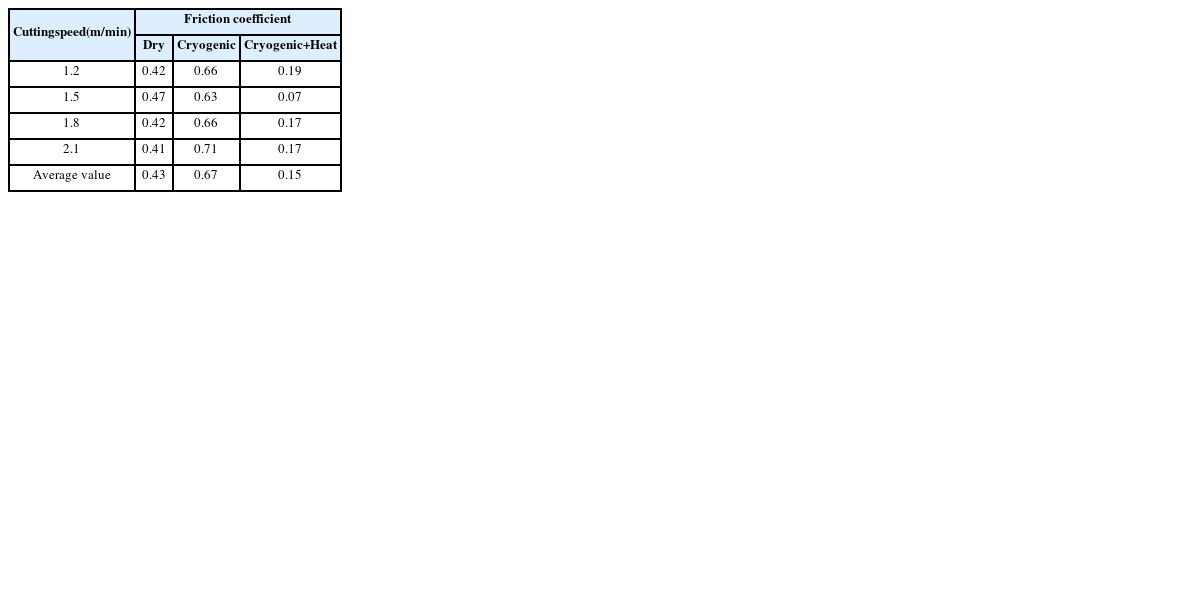 (3) ‘건식’ 조건에 비해 ‘극저온 + 소재 가열’ 조건에서 낮은 절삭 부하 및 마찰 계수가 나타났다.