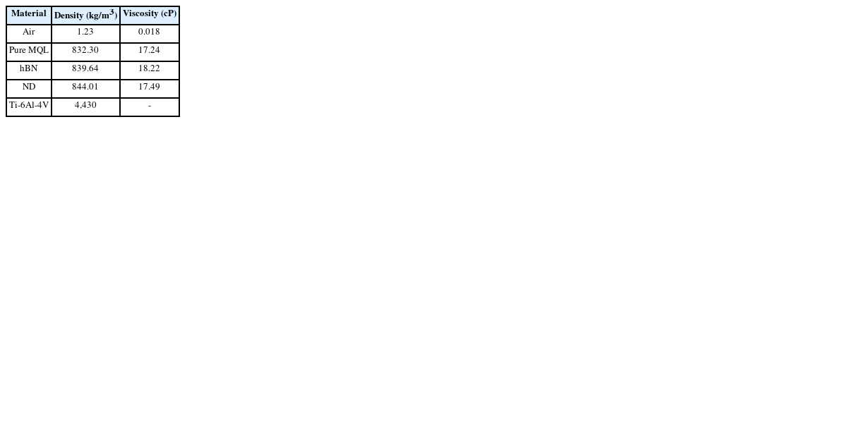 나노유체의 점도와 열전도도는 각각 Core-Tech 사의 Viscometer (SV-10), Julabo 사의 Refrigerated/Heating Circulator (FP-50)장치를 사용하여 측정된 값을 사용하였다. 해석에 사용된 공기, 순정오일, 각 나노유체 및 가공물 Ti-6Al-4V (Grade 5) 물성치는