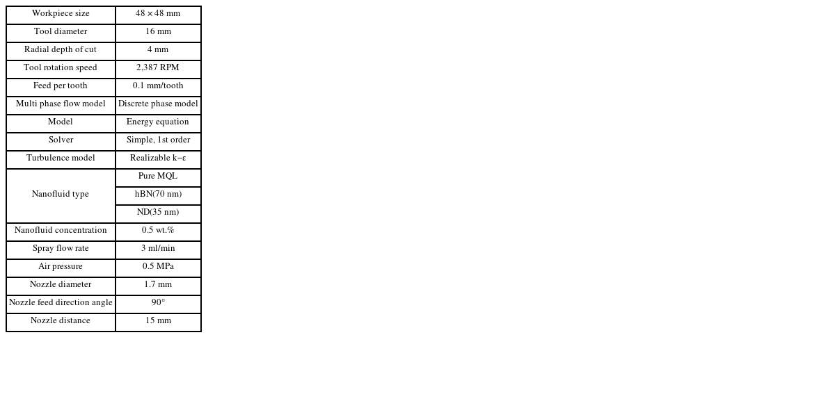 따라서 본 논문에서는 MQL 및 나노유체 MQL을 적용한 티타늄 합금 밀링 공정에서의 가공물의 열특성 분석을 위해 가공물에 설치된 열전대를 통해 각 윤활조건에서의 온도를 측정하고 또한 밀링 가공 환경을 모사하기 위해 개발된 CFD 기반 수치해석 모델로부터 가공물 온도를 계산하여 이를 측정값과 비교하여 수치해석 모델의 타당성을 검증하였다. 본 연구에서 고려된 윤활조건은 Pure MQL, Hexagonal Boron Nitride (hBN) 나노유체 MQL, Nanodiamond (ND) 나노유체 MQL이며 실험의 경우 가공물에 설치된 3개의 열전대를 통해 가공물 온도를 측정하였으며 수치해석 모델은 실제 실험 환경과 유사하게 구현하기 위해 공구 회전, 가공물의 이동, 나노유체 극미량 분사, 가공물의 절삭 운동이 구현되었고 각 조건에서의 밀도, 점도 및 열전도도를 입력하여 수치해석을 수행하였다.