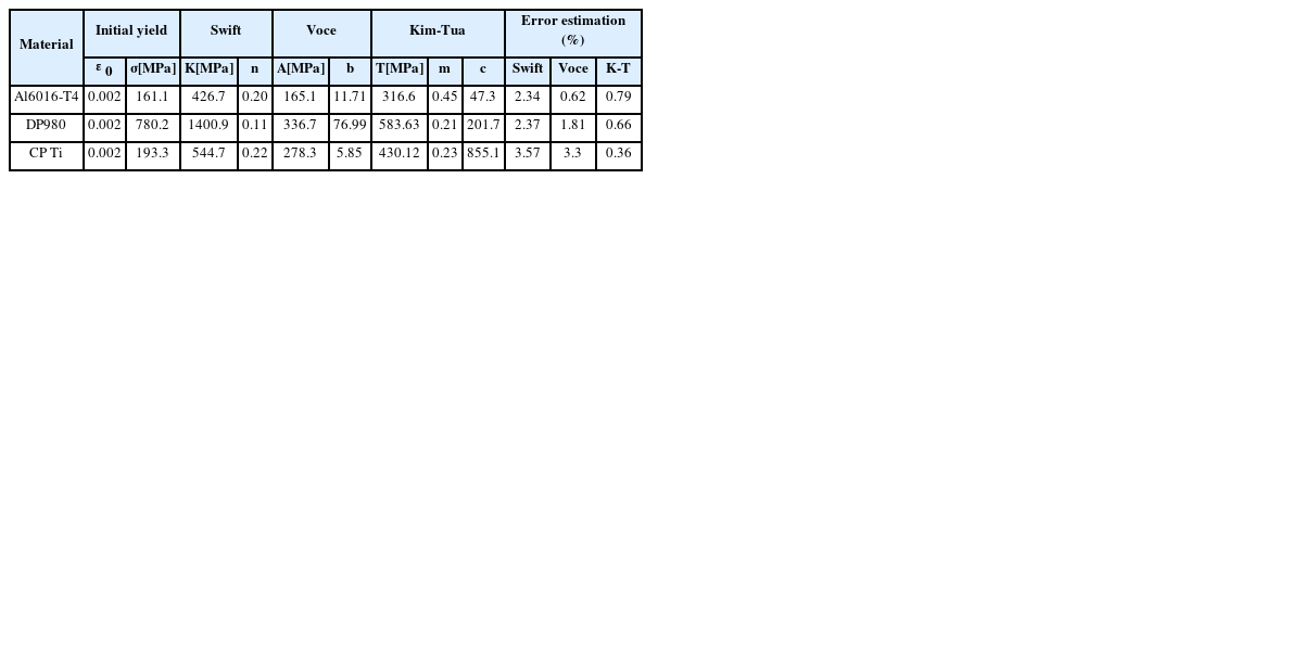 앞서 살펴본 바와 같이 CP Ti 판재는 이방성이 강한 재료이다. 본 연구에서는 VUMAT 서브루틴에 Kim-Tuan 경화 모델을 사용하여 등방성 경화 거동을 해석하였다. 이동 경화 모델은 배응력 진전 계산 과정에 적용하였다. 항복 함수로는 Hill의 48년 이방성 항복 조건식을 적용하였다. 서브루틴의 응력 적분 과정은 Taherizadeh의