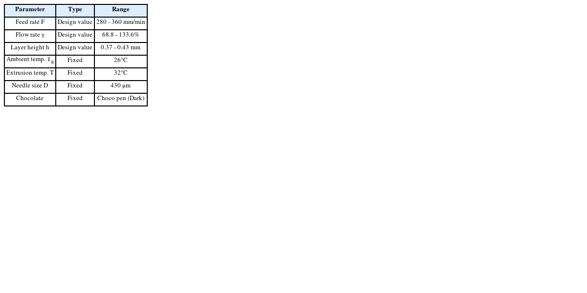 원하는 선폭(w)을 출력하는 최적의 조건을 찾기 위하여 Table 2의 인자에 대하여 실험계획법을 수행하였다. 앞서 언급한 대로 출력 온도(T)가 설정값보다 높으면 초콜릿이 원하는 출력 높이로 분사되지 않고 출력기판에 내려앉거나, 굳지 않아서 쌓이지 않게 되는 문제가 발생하였기 때문에 초콜릿의 출력온도는 설계변수에 포함시키지 않았다. 이송속도(F)는 초콜릿이 출력되면서 충분히 형태를 유지할 수 있는 시간이 필요하기 때문에 320 ± 40 mm/min의 범위로 선정하였다. 적층높이(h)는 출력되는 초콜릿이 일정한 모양을 유지하고 형상을 유지할 수 있도록 노즐 내경(D) 보다 조금 눌린 0.4 ± 0.03 mm의 범위로 선정하였다. 유동율(γ)의 범위는 68.8 - 133.6%로 설정하였다. 출력된 초콜릿의 선폭(w)을 반응 변수로 정하였으며, 디스 펜싱 노즐의 내경과 동일한 0.43 mm를 목표로 하였다.