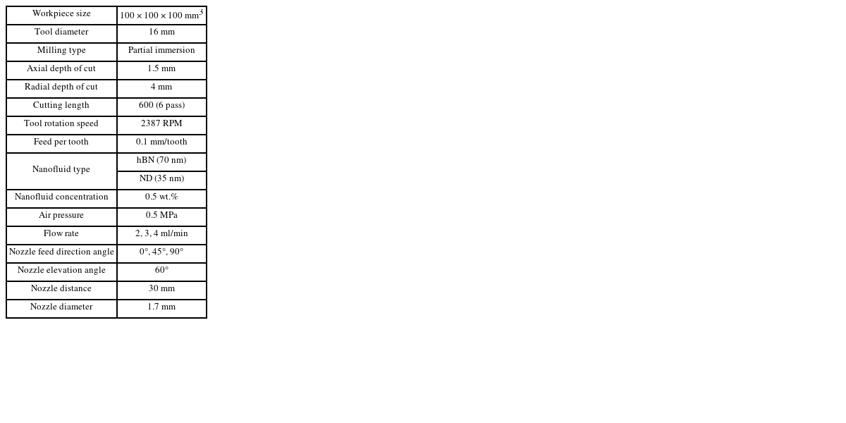 Table 1에는 나노유체 MQL밀링 가공 실험 조건이 요약되어 있다.