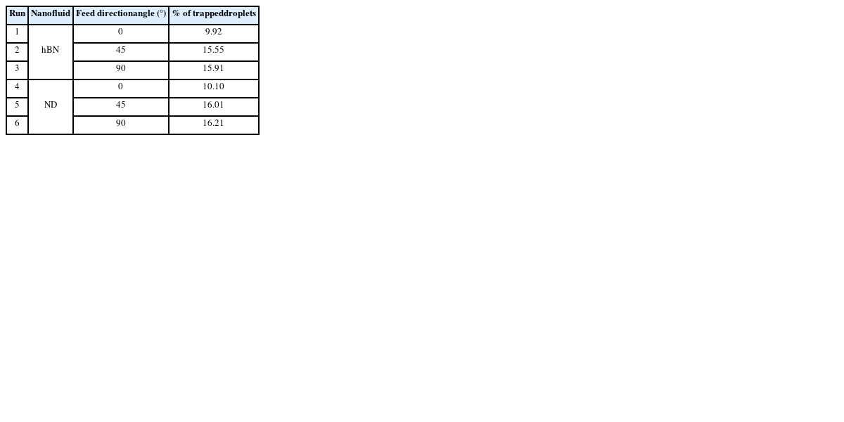 나노유체에 사용된 나노입자는 Hexagonal Boron Nitride (hBN)와 Nanodiamond (ND)이며, 크기는 각각 35 nm, 70 nm 이고, 질량비는 0.5 wt.%가 고려되었다. 나노유체 분사 유량 및 분사 각도가 독립변수로 고려되었으며, 절삭 합력이 관측 인자로 고려되었다. 실험에 있어서 나노유체 종류는 hBN, ND이며, 분사 유량은 2, 3, 4 ml/min, 이송 방향 분사 각도는 0°, 45°, 90°가 고려되었으며 총 18가지 조건으로 6 pass 반복 실험이 수행되었다.
