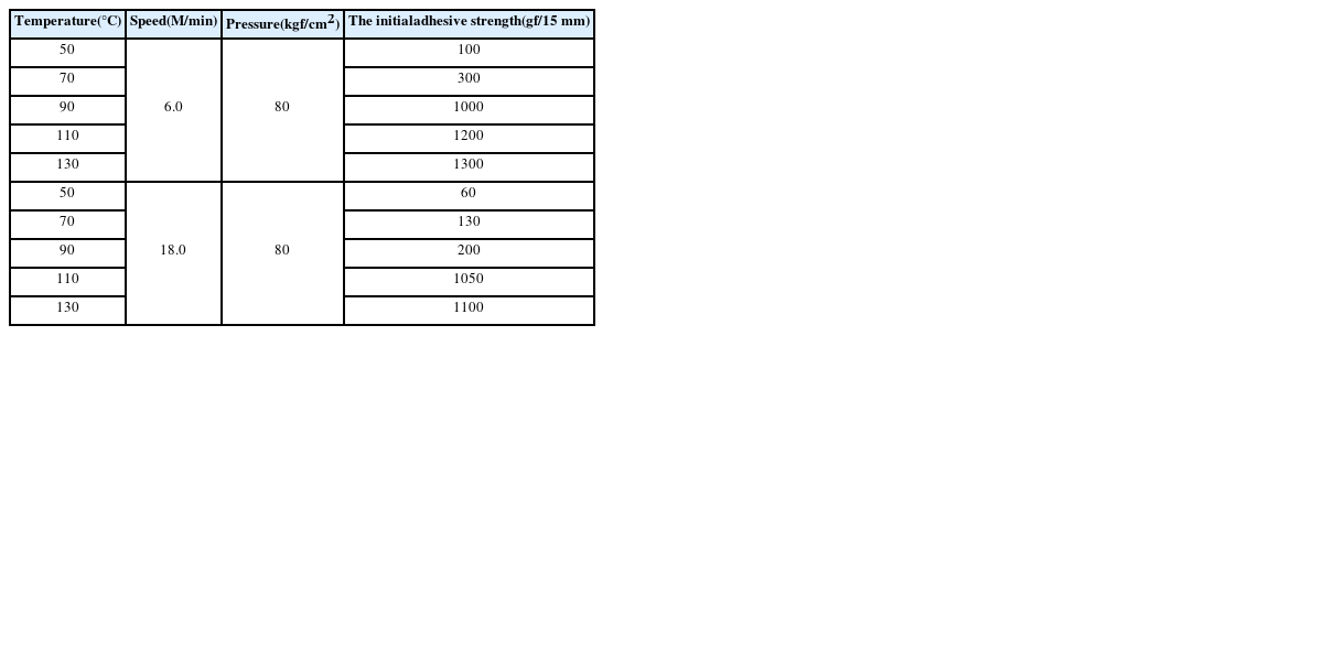 2의 조건으로 고정된 압력하에서 합지 속도가 6.0 M/min에서 합지온도가 50°C에서 초기접착력은 100 gf/15 mm로 매우 낮은 특성을 보였으며, 합지온도가 90°C 이상에서 1000 gf/15 mm 이상의 접착강도를 보여주었다. 합지속도가 18.0 M/min의 조건에서는 보다 높은 110°C 온도에서 1000 gf/15 mm 이상의 접착강도를 보여주었으며, 결과에서 보는 바와 같이 상대적으로 낮은 속도에서 높은 접착강도를 갖는 것을 확인할 수 있다.