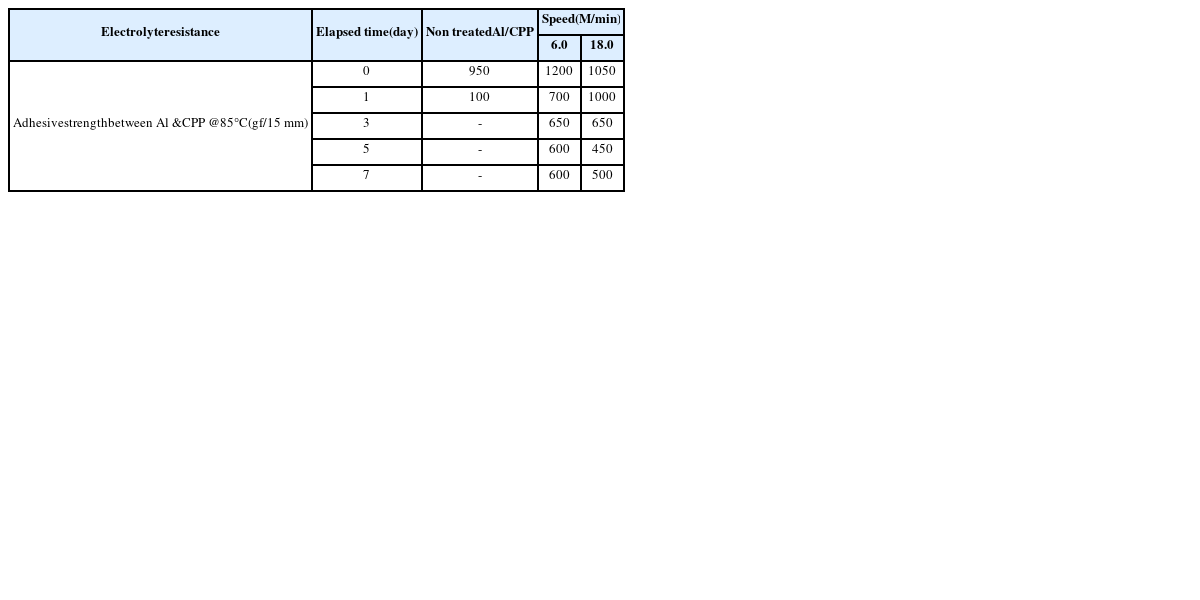 Table 1 The result of the initial adhesive strength between aluminum and CPP film according to the lamination temperature and speed