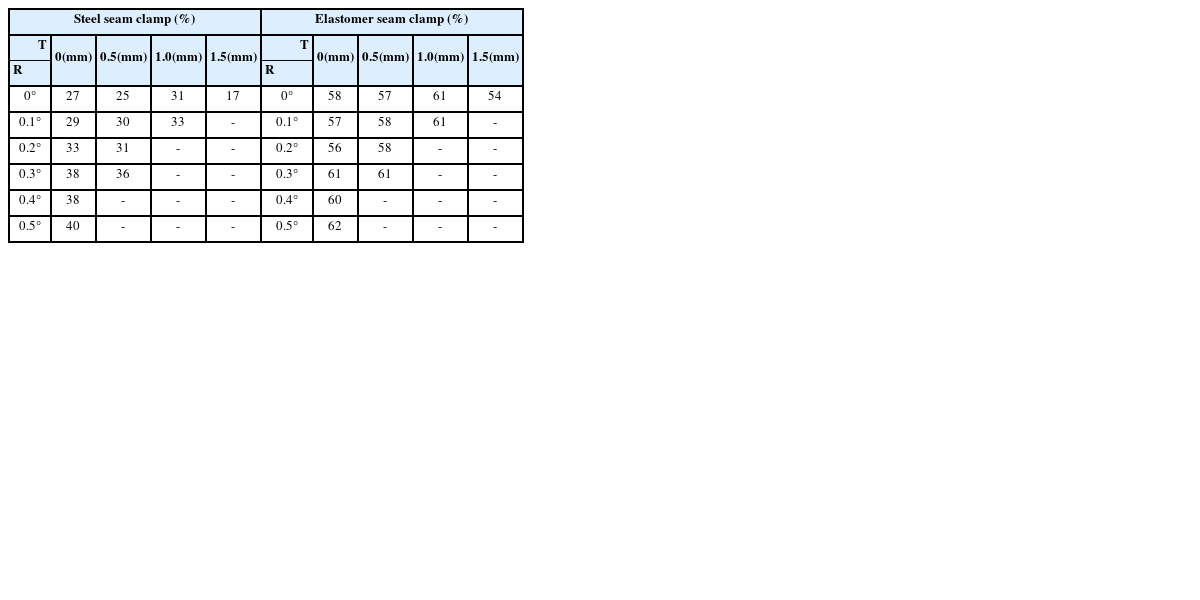 Table 5에서 스틸 심클램프는 오차 시나리오 상황에서 최소 0.34 MPa에서 최대 0.39 MPa의 평균 압력을 가압할 수 있으며 이때 최소 0.09에서 최대 0.31의 분산을 보인다. 이에 비해 복합 심클램프는 압력의 평균이 최소 0.41 MPa 에서 최대 0.47 MPa로 나타나며 0.17의 분산을 보인다. 오차 시나리오 상황에 따라 국부 가압이 발생할 경우 평균 압력의 변화는 미미하나 분산이 크게 변화한다. 따라서 3.2에서 가정한 바와 같이 복합 심클램프는 오차 시나리오 상황에서도 압력 분포의 분산의 차이가 미미하여 허용 조정 오차가 증대되었다고 판단하였다.