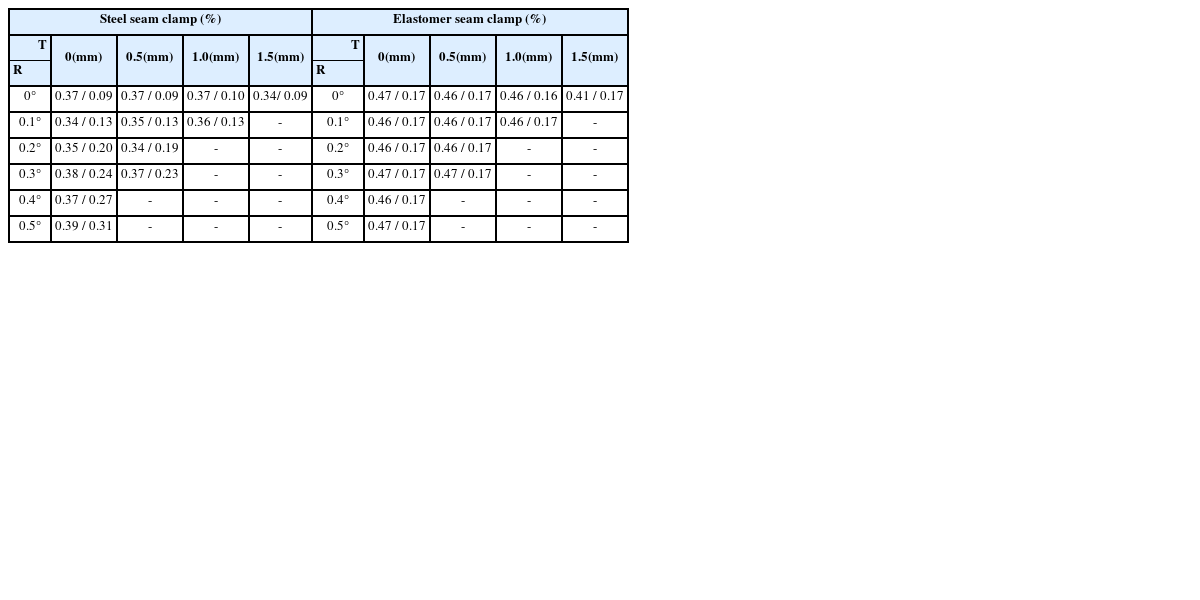 Table 4에서 스틸 심클램프의 경우 주요 접촉 영역에서 설계된 기준 압력 이상의 압력을 갖는 Mesh는 조정 오차가 없는 상황에서 27%를 차지하며, 시나리오 상황에 따라 최소 17%에서 최대 40%의 비율을 차지한다. 이에 비해 복합 심클램프는 조정 오차가 없는 상황에서 기준 압력 이상의 Mesh가 58%의 비율을 차지하며 시나리오 상황에 따라 최소 54%에서 최대 62%의 비율을 차지한다. 복합 심클램프는 설계된 기준 압력이상의 압력을 가하는 Mesh의 비율이 시나리오 상황 전반에서 기존 스틸 심클램프에 비해 높으므로 3.2에서 가정한 바와 같이 가압 능력 또한 우수하다고 가정할 수 있다. 이는 탄성중합체에 의한 응력 집중의 해소로 추정되며, 복합 심클램프는 기존의 스틸 심클램프의 자체 응력 집중 및 조정 오차로 인한 응력 집중을 해결 할 수 있다고 추정된다.