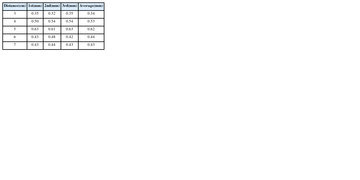 5 이때 포토센서가 처음 시편을 인식하는 위치와 인식이 끝나는 위치를 측정하여 적외선 센서 빔의 폭 ø를 구하였다. 실험은 적외선 센서가 시편의 검출이 가능한 범위인 3-7 cm에서 총 3회를 걸쳐서 진행이 되었다. 이 테스트의 진행과정을