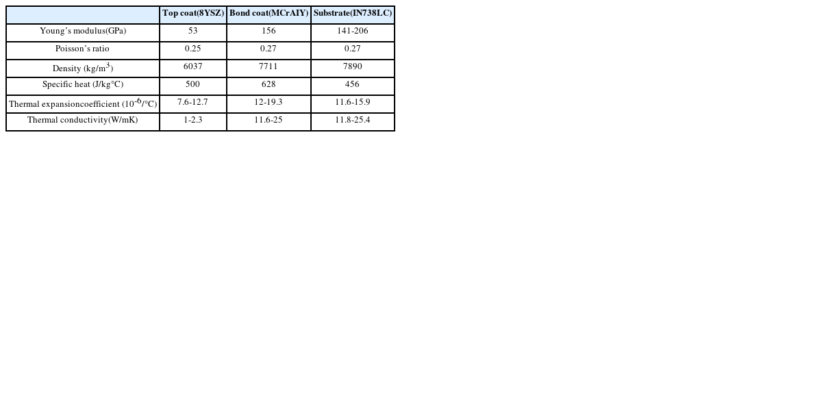 가스터빈 블레이드의 온도를 낮추기 위하여 사용되는 내부냉각 기술은 블레이드 외벽과 내벽 사이에 열구배를 발생시키는데, 그 결과로 열팽창의 차이에 의한 내부 열응력이 발생하게 된다.5 이에 본 논문에서는 내부 냉각에 의해 발생하는 열구배가 열차폐코팅의 내구성능에 미치는 영향을 연구하고자 한다. 열차폐코팅이 적용된 코인형 시험편에 열구배가 생길 때 발생하는 열응력을 유한요소해석을 통하여 도출하고 그 결과를 비교하여 내부냉각이 열차폐코팅에 미치는 영향을 고찰하였다.