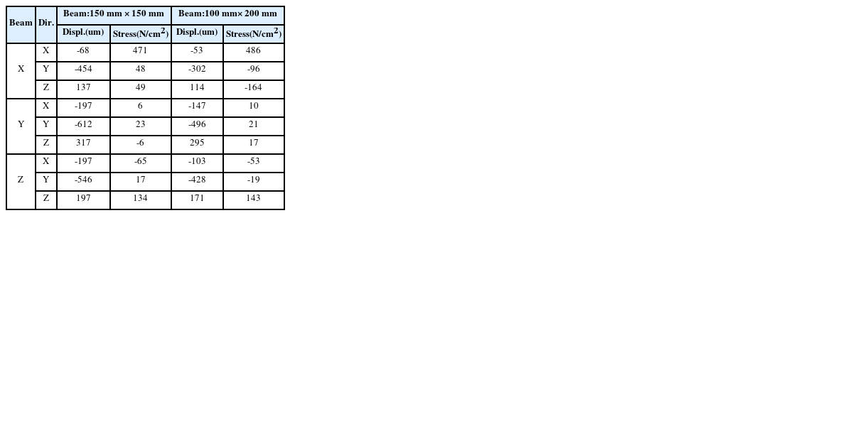 최대변위는 X축 빔의 경우 빔의 크기가 100 mm × 200 mm인 경우, X축 빔의 X방향 변위는 15 um, Y방향 변위는 152 um, Z방향 변위는 23 um적고, Y축 빔의 X방향 변위는 50 um, Y방향 변위는 116 um, Z방향 변위는 22 um적으며, Z축 빔의 X방향 변위는 94 um, Y방향 변위는 118 um, Z방향 변위는 26 um적게 나타났다.