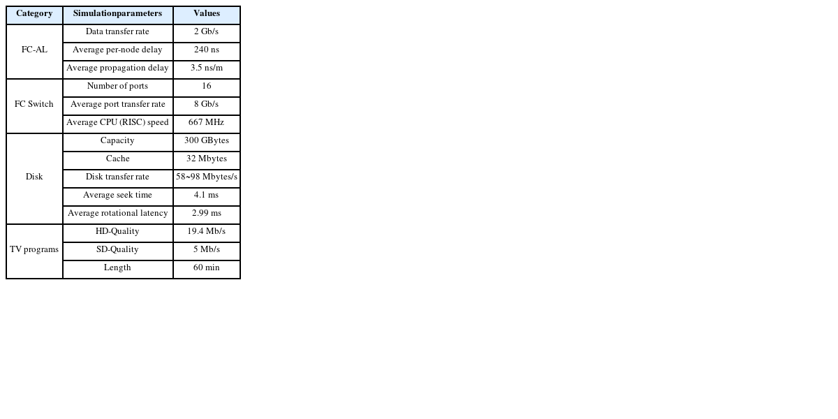 14 The broadcast programs are also distributed evenly among loops and the probability that each program is requested is uniform so that the amount of data traffic between each pair of loops can be fairly compared. The request rate of program playback follows a Poisson distribution. Each available STB issues requests for different programs every 60 minutes. It is also assumed that 126 STBs are connected to each loop and half of them on average are available at a specific time. Note that the routing between two loops is determined by the number of hops and the tie-breaking is determined randomly. The details of parameters used for disks and FC-AL are also described in