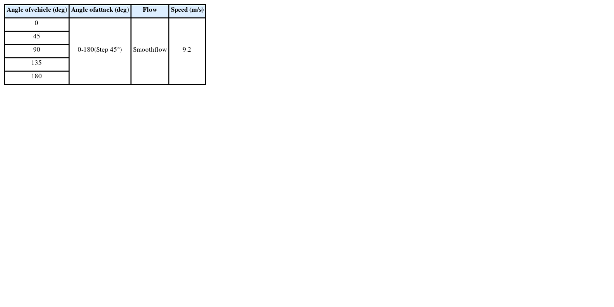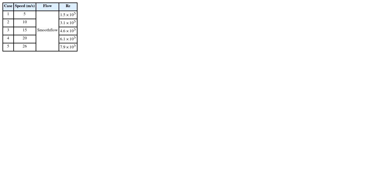 여기서 FD, FS, FL, MR, MP, MY는 각각 Drag Force, Side Force, Lift Force, Rolling Moment, Pitching Moment, Yawing Moment이고, ρ는 공기밀도, A는 실험모형의 면적, H는 실험모형의 높이, U는 평균 풍속이다.