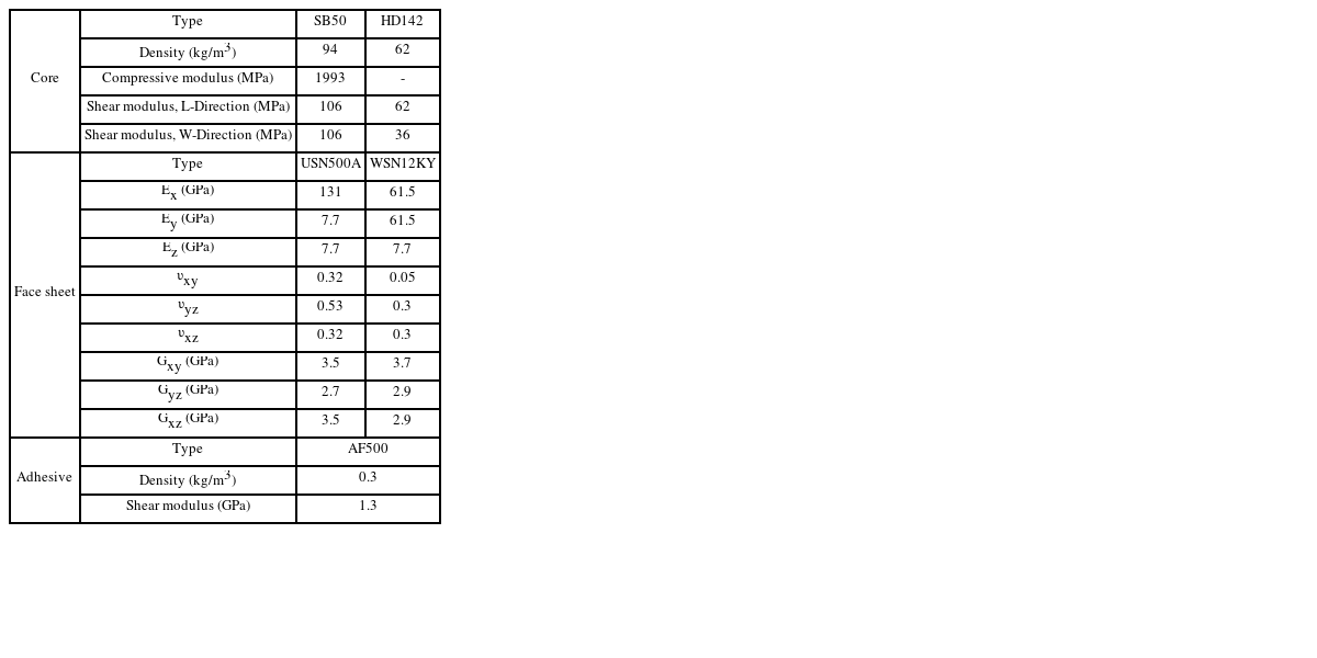 본 연구에 사용한 발사우드 샌드위치 압축시편은 다음과 같다. 스킨층은 SK Chemical 社에서 생산하는 탄소섬유/에폭시 프리프레그 중 일방향 프리프레그(USN500A)와 직조 프리프레그(WSN12KY)을 사용하였고, 코어는 BALTEK 社의 SB50 발사우드를 적용하였으며, 스킨층과 코어 사이에 적용된 접착필름(Adhesive Film)은 3M사의 AF500 적용하였다. 또한 허니컴 코어 샌드위치 복합재에 있어 허니컴 코어는 M.C.GILL 社의 HD142를 사용하였다. 각 소재에 따른 자세한 물성은