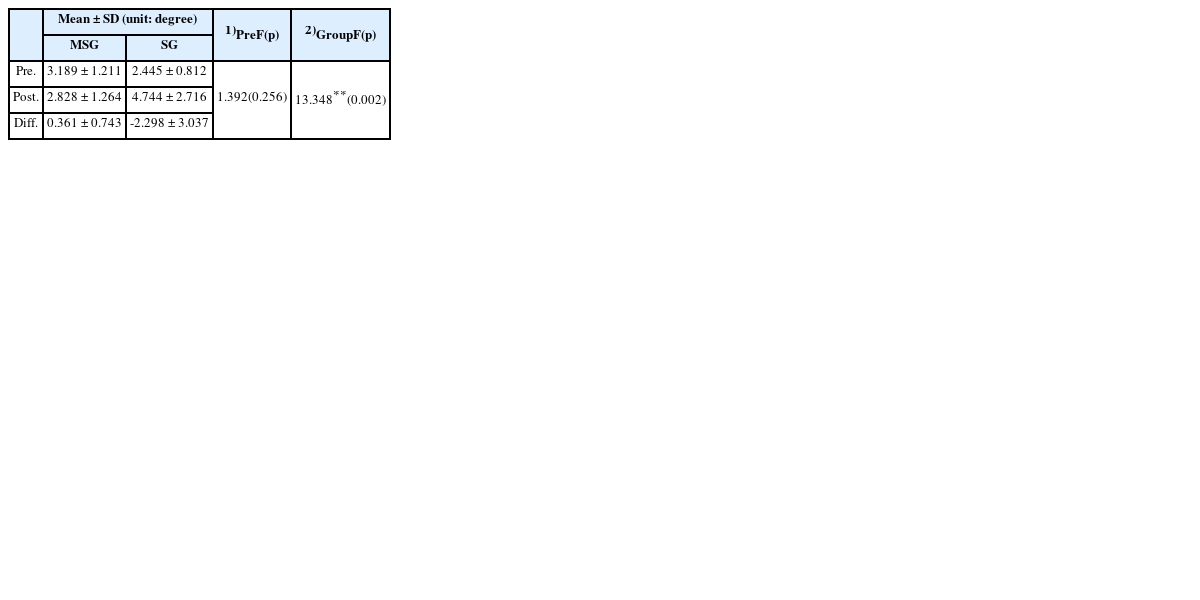 The Mann-Whitney U-test was performed to compare the range of motion of full dorsi-flexion, dynamic balance ability of the MSG with those of the SG. The Wilcoxon signed-rank test was used to investigate changes in the range of motion of full dorsi-flexion, dynamic balance ability of each group pre- and post-intervention. The analysis of covariance (ANCOVA) was performed to compare the JPS error of dorsi-plantar flexion of the MSG with those of the SG. The covariance was pre-intervention value.