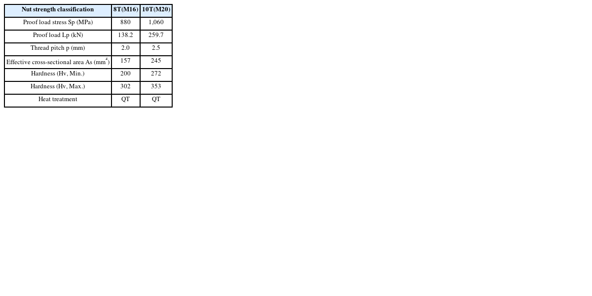 9의 기계적 성질의 강도 구분에 따라 M16은 너트 본체 강도 등급 8 T, M20은 너트 본체 강도 등급을 10 T으로 하였다. 재사용 가능한 풀림 방지 너트 본체의 기계적 성질은