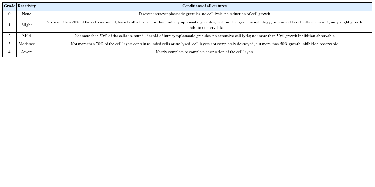 Table 2와 같이 음성대조물질 용출액을 적용한 세포는 0등급, 양성대조 물질 용출액을 적용한 세포는 4등급으로서, 시험과정 및 시험조건 중 특이사항은 없었다. 시험물질 용출액의 결과는 0등급으로 세포의 용해 정도나 성장저해 정도가 거의 나타나지 않았으므로, 본 시험 조건하에서 사용된 시험물질은 세포독성이 없는 것으로 사료된다.