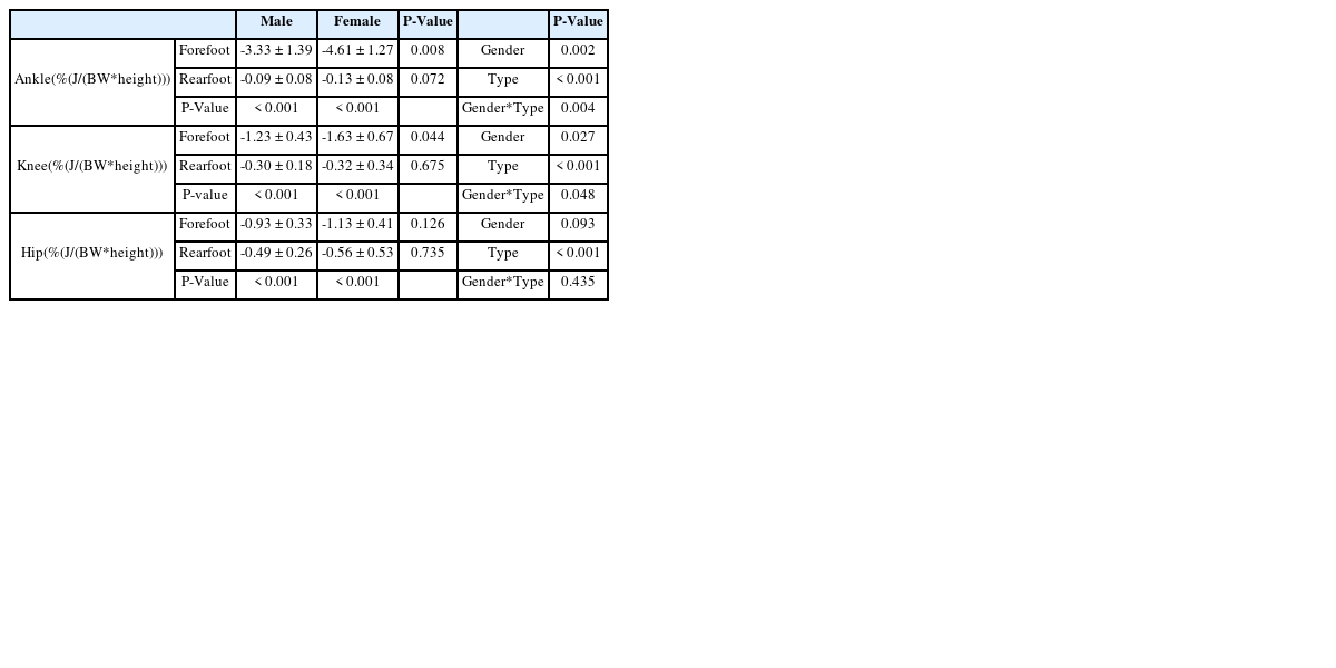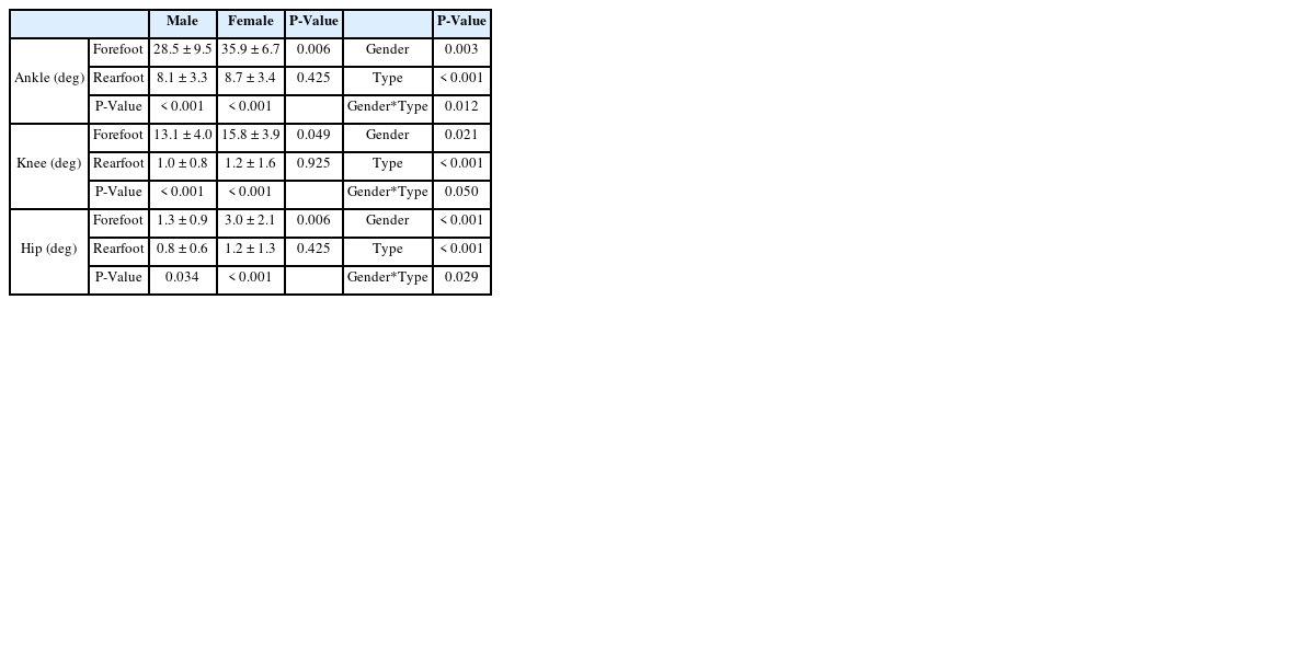 Table 2). 전족착지 시에는 각 하지 관절에서 여성이 남성에 비해 통계적으로 큰 가동범위를 보인 반면, 후족착지 시에는 차이를 보이지 않았다(