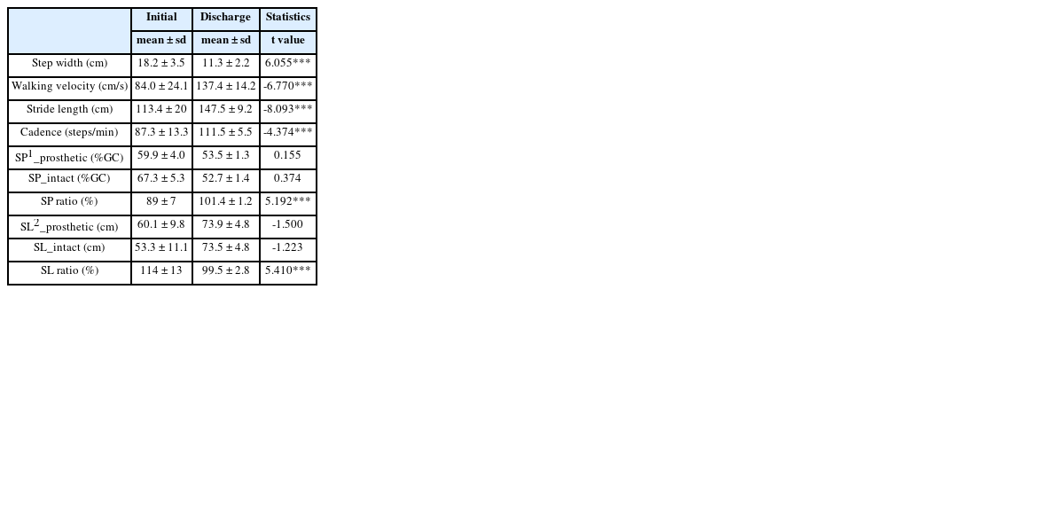 편측 대퇴절단자군 내 통합재활훈련 전후 시공간적 요인의 차이에 대한 분석 결과는 Table 2와 같다. 연구 결과, 보폭은 훈련 후 6.7% 감소하였으나 통계적으로 유의한 차이를 보이지 않았으며, 보행속도는 49.2% 유의하게 증가하였다(p < 0.001). 또한 활보장과 분속수도 각각 26.4%, 20.7% 유의하게 증가하였으며(p < 0.001). 입각기는 훈련 후 의지측과 건측 모두 감소하는 경향을 보였다(p < 0.05, p < 0.001). 걸음길이는 의지측과 건측 모두 유의하게 증가하였지만(p < 0.001), 걸음길이비율은 2.6% 감소하면서 통계적으로 유의한 차이를 보이지 않았다.