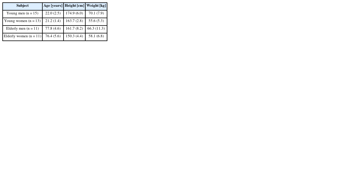 p > 0.25). 피험자들은 지팡이나 의지 착용 없이 스스로 보행이 가능한 사람으로 선별되었고, 자세 제어 영향을 줄 수 있는 당뇨병, 신경계 및 근골격계통의 질환자들은 본 연구에서 제외되었다. 본 연구는 연구윤리위원회 승인과 피험자들의 동의를 받은 후 수행되었다.
