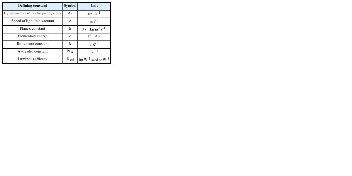 앞에서 말한 미터와 초 외에 나머지 SI 기본단위들의 현재 정의는 다음과 같다.
