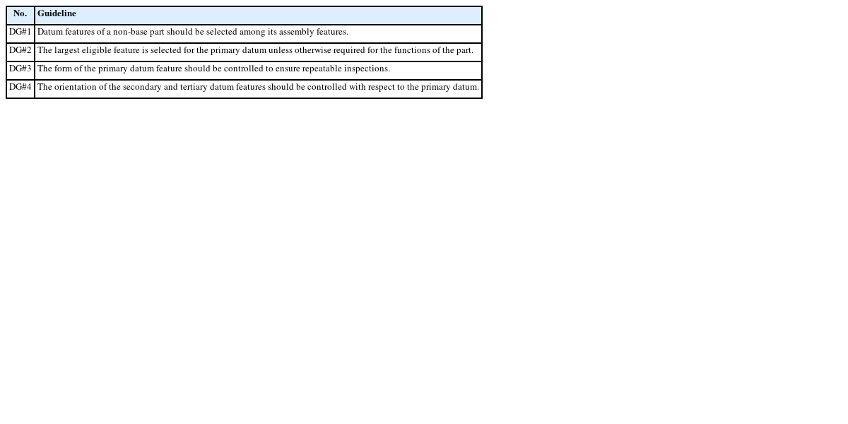 Table 2에서 DG#1은, 2.4.1절에서 설명한 바와 같이 베이스 부품이 아닌 경우 조립형체 중에서 데이텀 형체를 선정하여야 함을 의미한다. DG#2는 후보 형체 중에서 가장 큰 형체를 1차 데이텀으로 사용함으로써 측정의 재현성을 확보하기 위한 것이다. 여기서 형체들의 크기란 축의 경우 그 길이를 의미하고 평면의 경우 가장 긴 변의 길이를 의미한다. DG#3과 DG#4도 데이텀 좌표계(Datum Reference Frame, DRF) 정립의 명확성과 재현성을 위한 것이다. 즉, 1차 데이텀 형체는 형상이 관리되어야 하고, 하위 데이텀 형체들은 1차 데이텀을 기준으로 방향(많은 경우 수직)이 관리되어야 한다는 것이다.