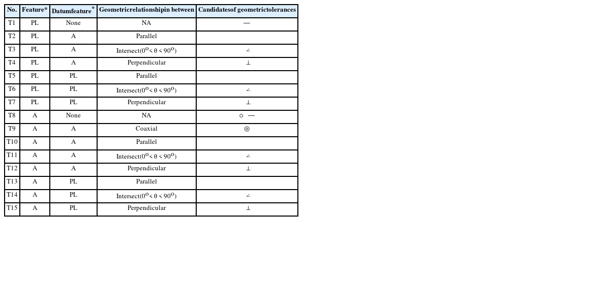 데이텀들의 다양한 조합은 여러 기존 연구3-6에서 각자의 방법으로 표현하고 있으나 대부분 수학적 엄밀성을 추구하여 이해하기 어렵다. 본 논문에서는 이들을 종합하고 개편하여 실용성이 높은 데이텀 조합만을 Table 1에 정리하였다. 자유도 제약을 표현함에 있어 Ri는 회전 자유도, Ti는 병진 자유도를 의미하고, 데이텀 평면(PL)과 데이텀 축(A)의 방향은 괄호 안에 ⊥(수직) 또는 ∥(평행)를 사용하여 표시했다.