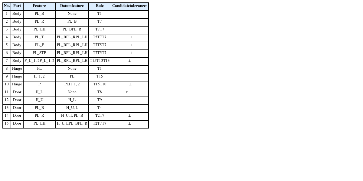 Fig. 11에서 KC 구현 경로를 작성함에 있어 가급적 최단 경로를 선정하였으며 이는 앞에서 설명한 바와 같이 공차의 누적을 최소화하기 위한 것이다. Table 5에서 아직 정해지지 않은 기하공차들은 KC_1, KC_2로는 정해지지 않는 것이며, 다른 KC에 의해 정해질 수 있을 것이다. 예를 들어, Door와 Body 사이의 측면 갭 크기를 KC로 삼았다면, 다수의 위치도, 윤곽도, 치수공차 등이 필요할 것이다.