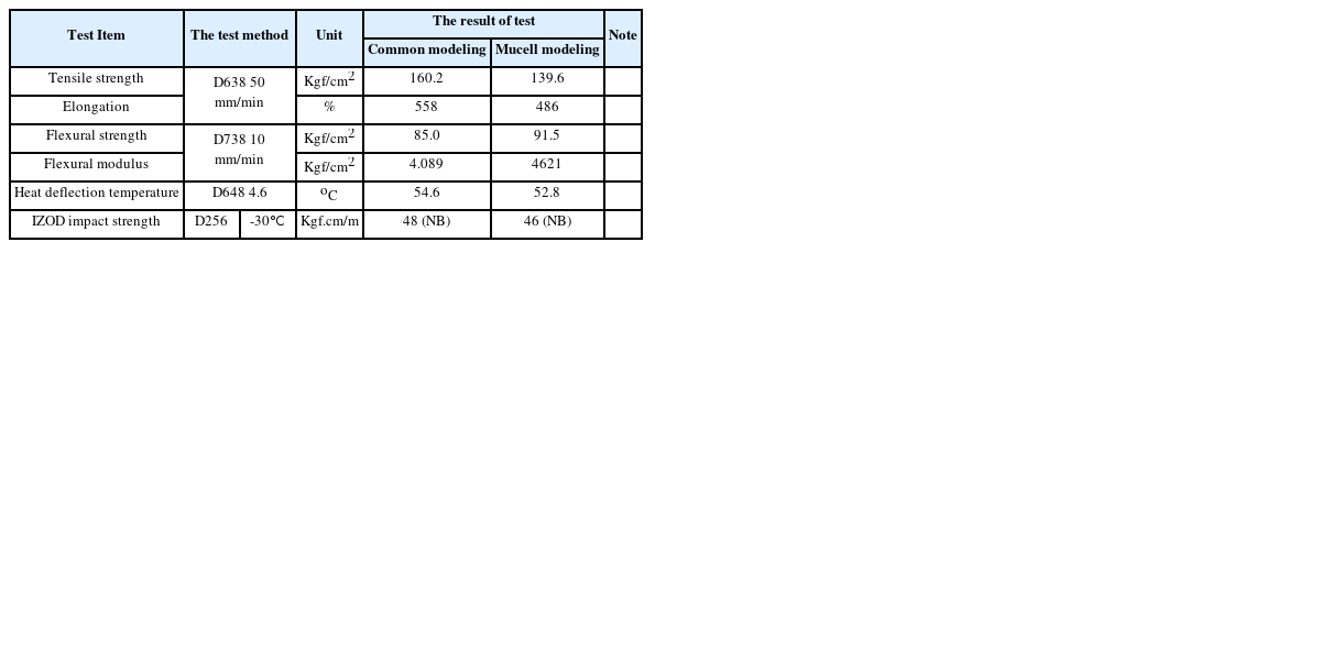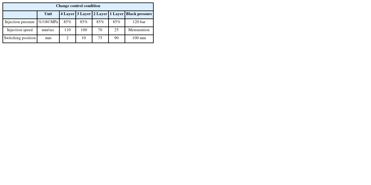 Table 2와 같다. 뮤셀 성형조건 중 특이점은 보압공정이 없는 것이다. 일반적으로 보압공정은 충진완료 이후 발생하는 재료수축에 대한 보상공정으로써, 러너가 고화되어 압력전달이 차폐되기 전까지 일정압력을 유지시켜 제품의 수축 및 변형을 방지하는 공정이다. 그러나 뮤셀성형에서는 수축에 대한 보상을 제품 내부의 뮤셀 발포압으로 대체하게 되므로 별도의 보압공정이 필요없게 된다.