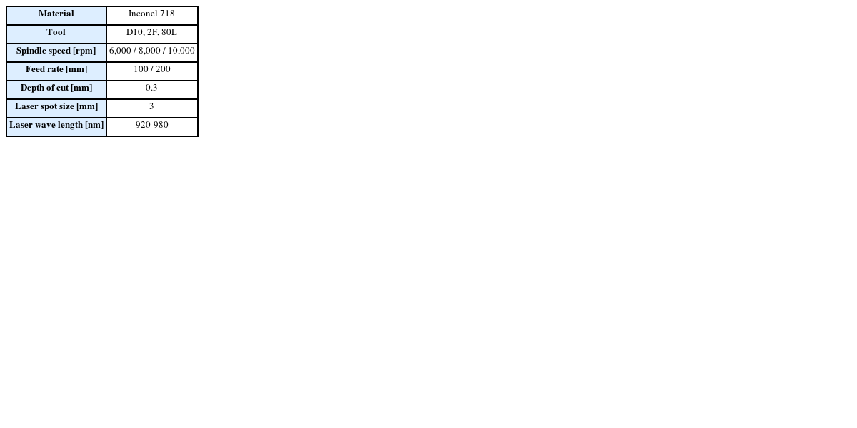 실험에 사용된 소재인 Inconel 718는 온도변화에 따라서 약 750oC 연신율이 증가하며 약 950oC에서 최대가 되는 물성치의 변화에 따라 레이저를 표면에 조사하였을 때 발생하는 표면에서부터 중심방향까지의 온도분포를 참고하여 950-750oC까지의 온도분포를 유효 절삭 깊이로 선정하였다.