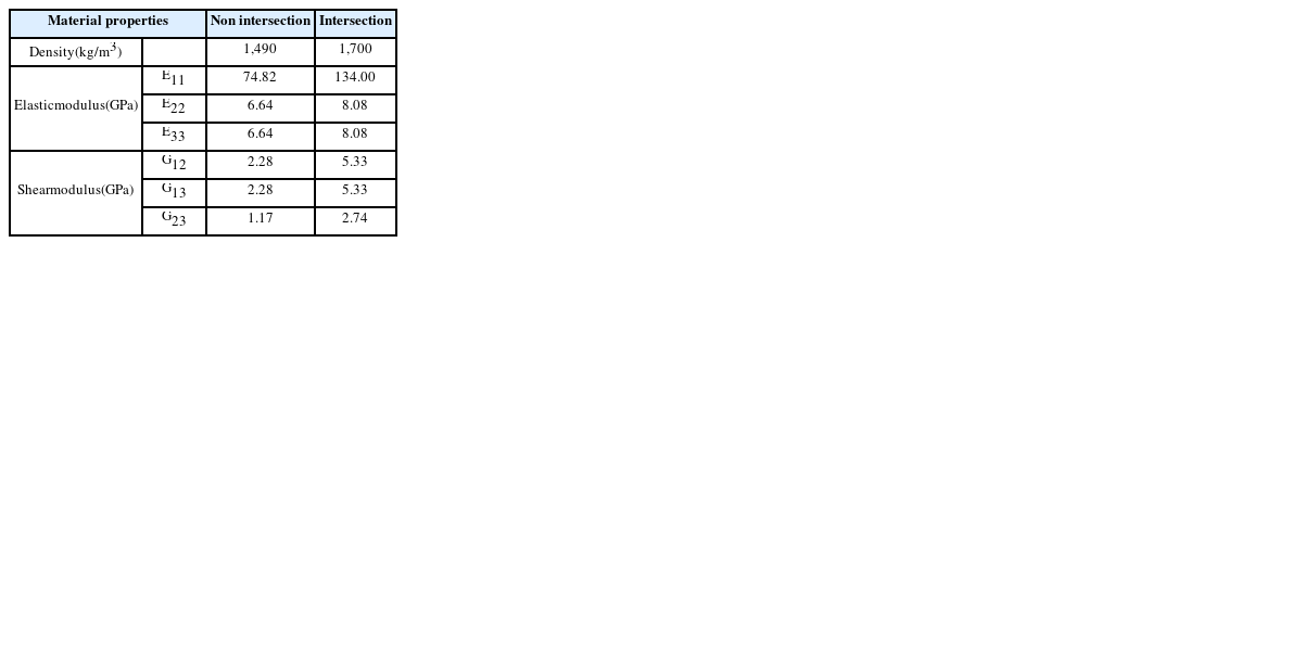 Table 2의 소재 물성이 고유진동수 해석에 적용되었다. 이때 섬유 교차부와 비교차부의 섬유 체적률을 측정하여 각각 0.7과 0.3을 확인하였으며