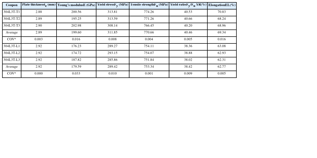 1 requirements for minimum yield strength in STS304L are 170 MPa and 175MPa, respectively. Minimum tensile strength requirements in STS304L are 485 MPa and 480 MPa, respectively. Mean elastic modulus for 304L3T-L coupon is 179.59 GPa, yield strength is 289.42MPa and tensile strength 753.34MPa. Mechanical properties of test coupons satisfy the requirements of ASTM and KS.
