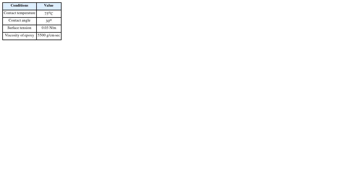 언더필 해석을 위하여 고려한 조건은 에폭시와 기판의 접촉 시 온도, 접촉 각도, 표면장력의 크기와 에폭시의 점도이다. 각 조건에 대한 값은