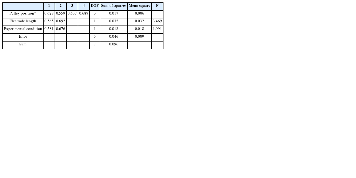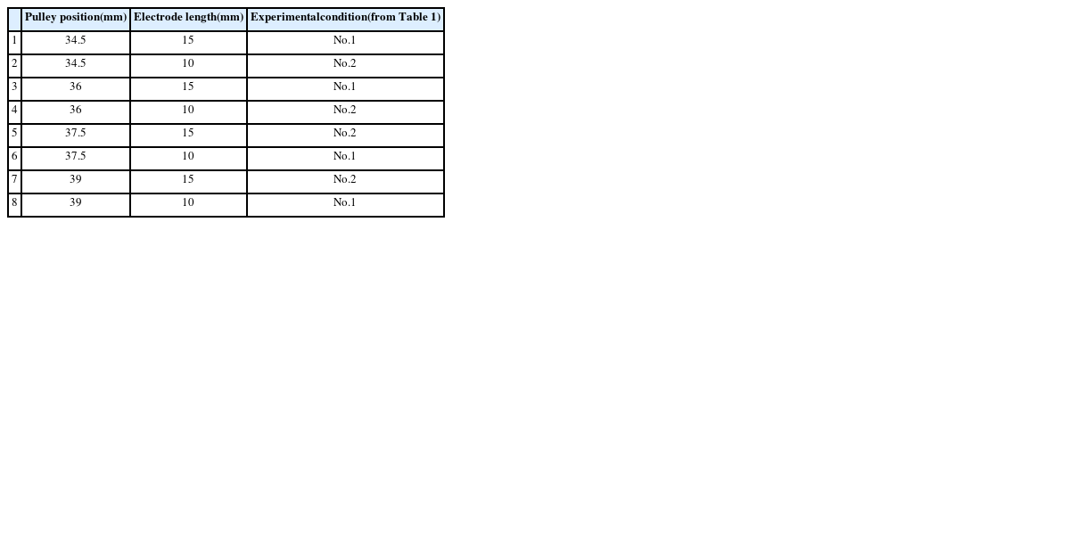 풀리 위치, 전극 길이, 실험 조합의 3가지 제어인자를 L8 Table 2에 배치하여 8번의 실험 조건을 생성한 후 실험을 진행하였다. 각 실험조건에서 실험을 각각 3번 수행하였으며 평균값을 구한 후 평균값을 이용하여 분석을 실시하였다.