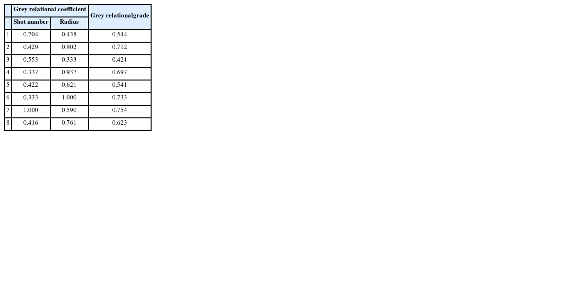 그레이 관계 계수 및 등급을 구하기 위하여 Table 8의 각 실험조건에서 얻어진 쇼트 수와 반지름을 크기를 식(5)(망소 특성)에 의하여 정규화하였고 그 결과를 Table 7에 제시하였다. 이 값들과 식(7)식(12)를 이용하여 그레이 관계 계수와 그레이 관계 등급을 구한 결과가 Table 8에 주어졌다. 이때 쇼트 수보다는 최소 반경이 더 중요하다고 생각하여 쇼트 수는 0.4, 최소반경에 0.6의 가중치를 주어 계산했다. 가중치는 식(13)의 b값에 해당하며 이 값들의 합은 1이 되어야 한다. 이렇게 얻어진 그레이 관계 등급을 이용하여 분산 분석을 실시하였고 그 결과를 Table 9에 보여졌다.