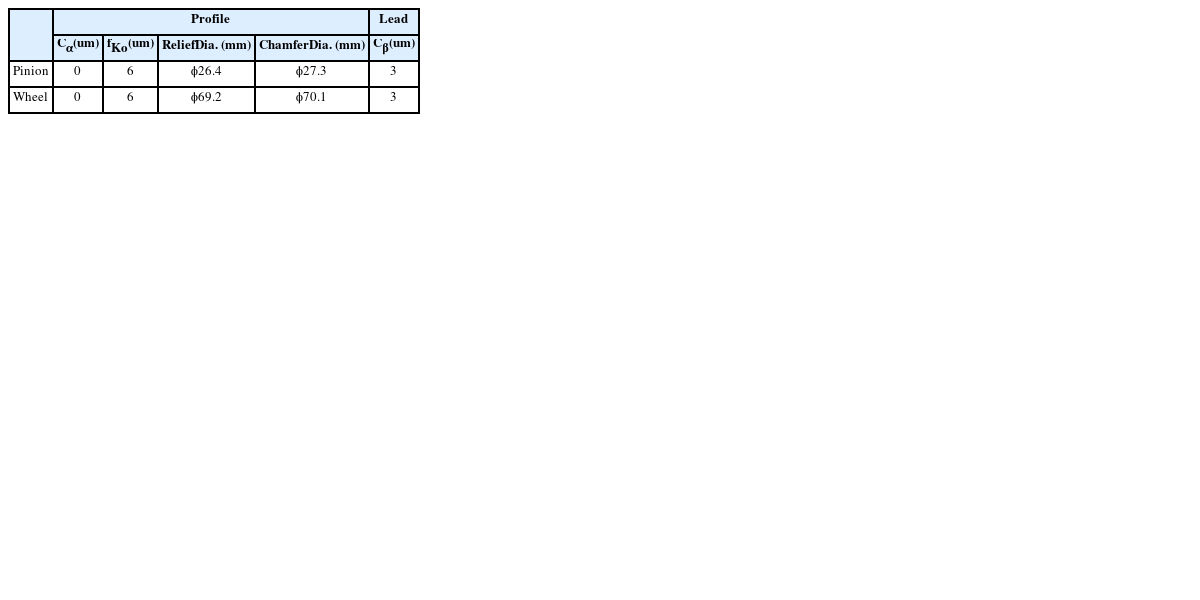 As we known, micro-modification parameters cannot be varied individually to evaluate the sensitivity of the durability and NVH performance, and even ideal designs can rarely be manufactured for mass production. But in order to quickly evaluate the results of the nominal modification, esp. profile tip relief, only nominal values of gear micro-modification are used for this gear pair without the consideration of manufacturing tolerance. And the nominal modification parameters are given in