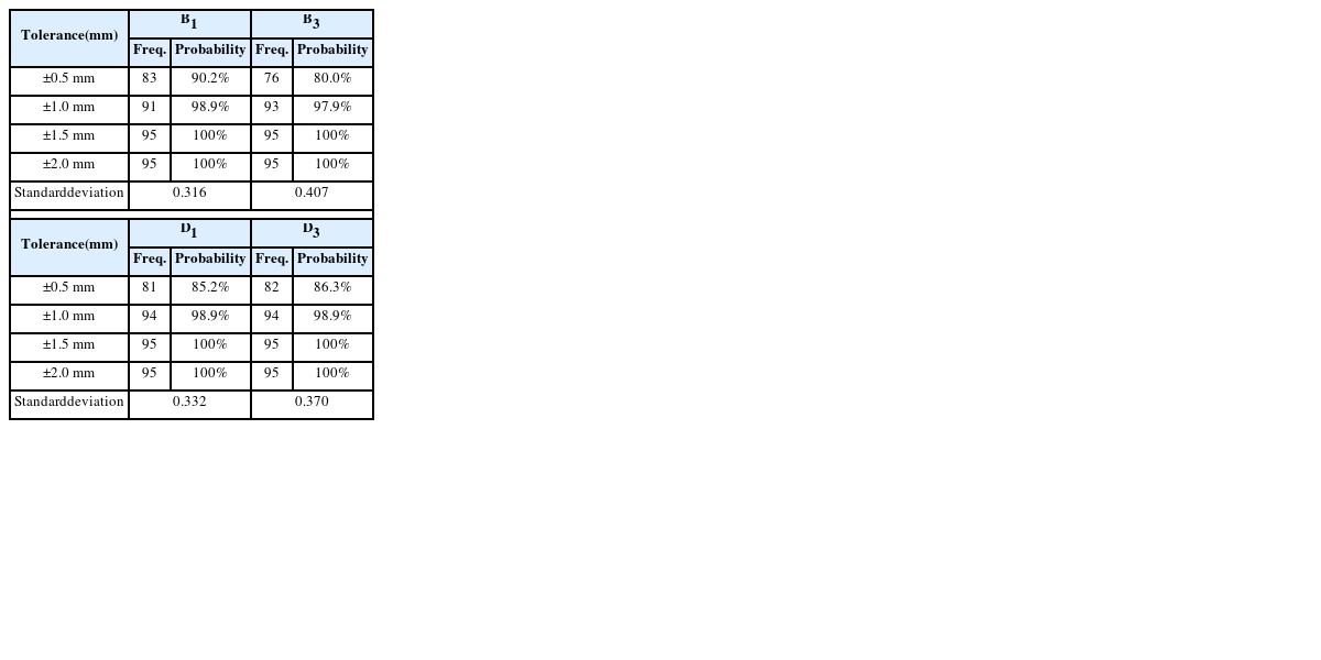 Table 4에 도시하였다. 발생된 스프링백 평균값에서 ±0.5 mm의 공차범위를 만족하는 확률이 49.5% - 65.3%로 나타났다. 이는 결정론적인 해석에서 얻어지는 평균 스프링백 값에서 공차 1 mm를 벗어날 확률이 50% 정도가 됨을 의미하며, 일반 프레스 부품의 합격기준을 상회하는 수치를 보일 수도 있음을 보여준다. 스프링백 산포에 가장 큰 영향을 미치는 항복강도의 산포 영향을 정량화하기 위하여 항복강도의 산포를 고려하지 않고 산포분석을 실시하였다.