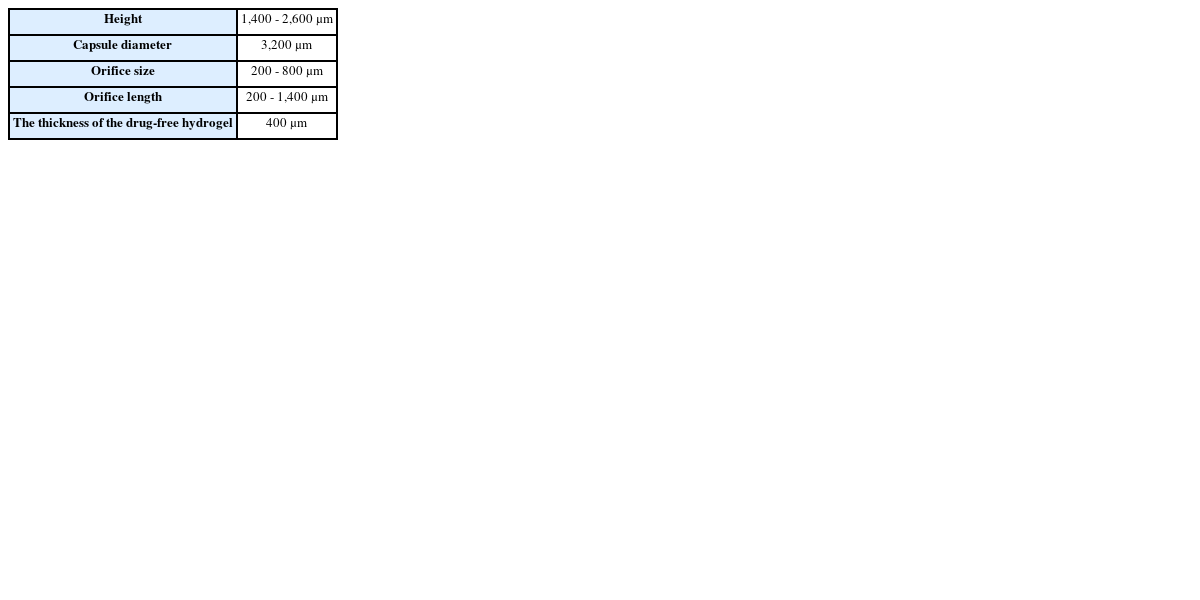 Table 1의 디자인을 기준으로, 캡슐 구멍의 지름과 길이, 약물이 내재된 하이드로젤의 두께 및 Pluronic F127 젤의 농도를 변화시키며 다양한 종류의 약물 전달 시스템을 제작하였다. 약물의 방출 실험은 제작된 시스템을 37