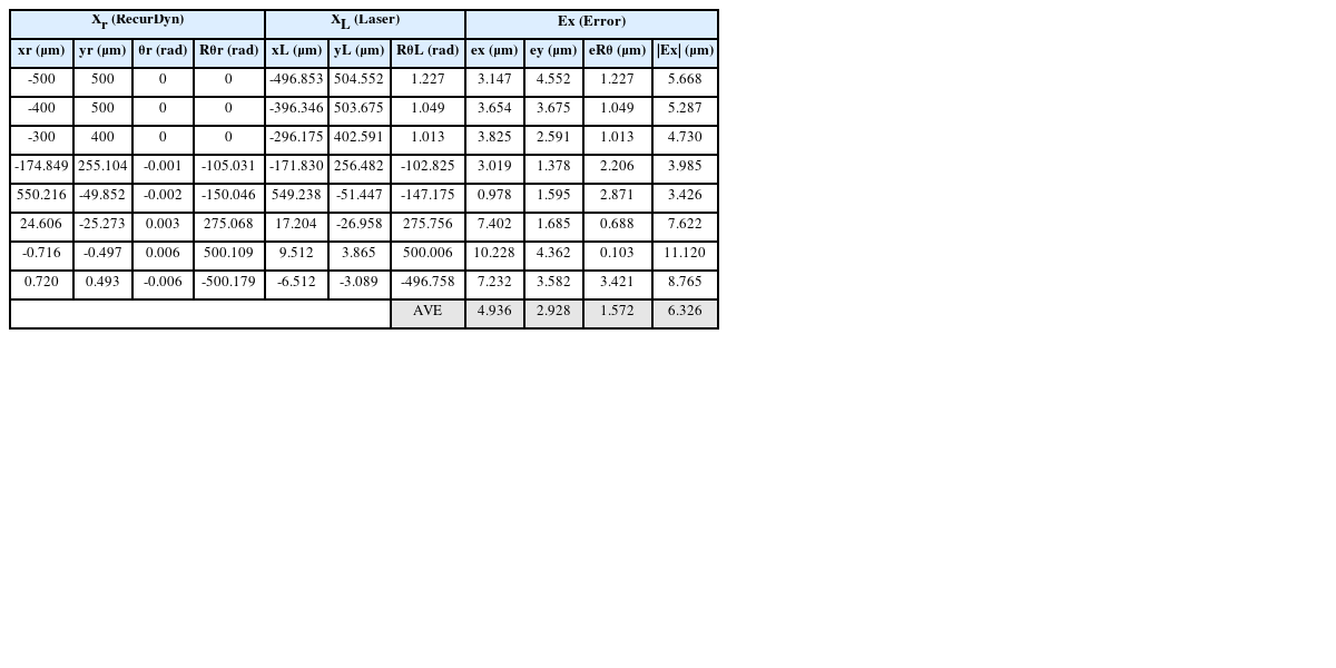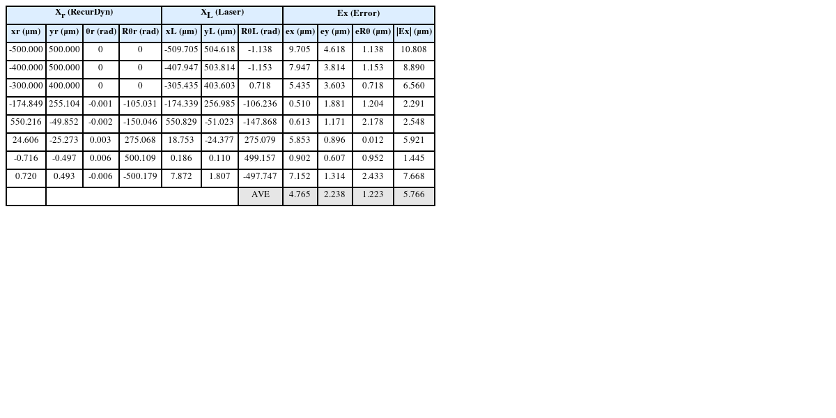마지막으로, 두가지 기구학 방법에 대하여 이론적으로 구한 기준값과 실험을 통하여 구한 측정값의 오차를 구함으로써, 정확도를 구하였다. 결국 두가지 기구학 방법에 대한 정확도를 비교분석함으로써 각각의 방법에 대한 성능을 비교평가할 수 있었고, UVW 스테이지의 효율적인 모션구동방법에 대한 근거를 마련하였다.