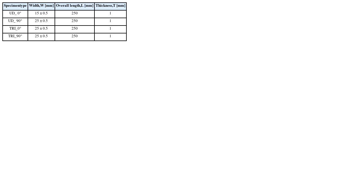 본 연구에 사용된 블레이드는 GFRP (Glass Fiber Reinforced Plastics)로 적층 되어 있다. GFRP는 단축 UD (Unidirectional)과 삼축 TRI (Tri-Directional)로 구성되어 있으며 UD의 경우 0°, 90°로 시편을 제작하였으며 TRI의 경우 0°, 45°, 90°를 0°, 90°로 등가하여 시편을 제작하였다. 시편의 타입은 UD_ 0°, 90°, TRI_0°, 90°로 총 4종류 이며 시편 수는 5개로 시험을 진행하였다. Fig. 2은 GFRP 인장시편에 대한 도면을 나타내고 있으며 Table 1은 시편 타입 별 너비, 전체 길이, 두께를 나타낸 것이다.