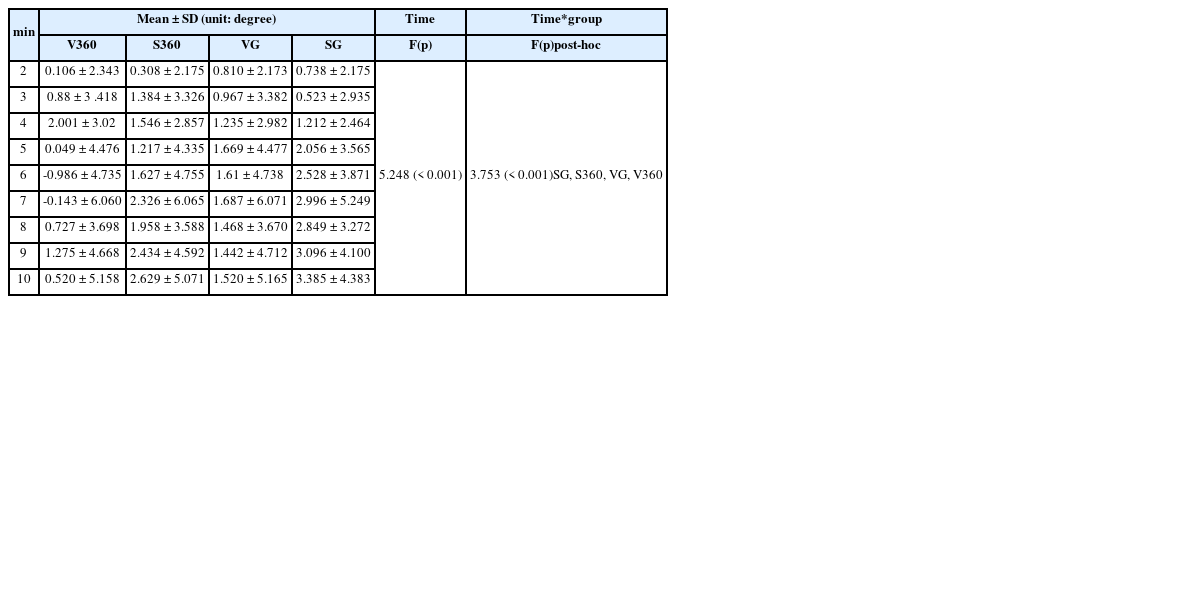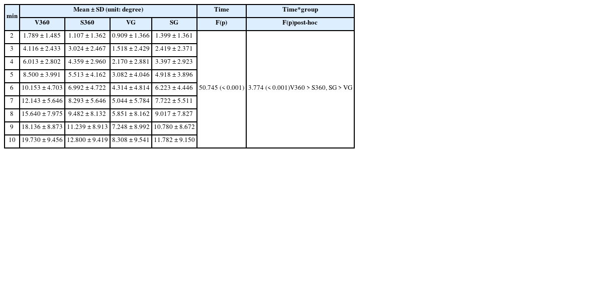 25 reported that about 10% of people who were wearing glasses complained of discomfort with their glasses. Although the weight of the VR apparatus has become lighter due to technological advancements, the total weight of the latest VR, and the smartphone mounted to VR in the present study was about 0.5 kg. It was speculated that such weights would enhance fatigue in the neck and the upper back muscles in order to bend the neck or prevent the head from bending forward. For the median frequency of the erector spinae and the upper trapezius muscles, however, V360 and S360 formed a high group and VG and SG made a low group depending on time and the conditional effect. In other words, the 360