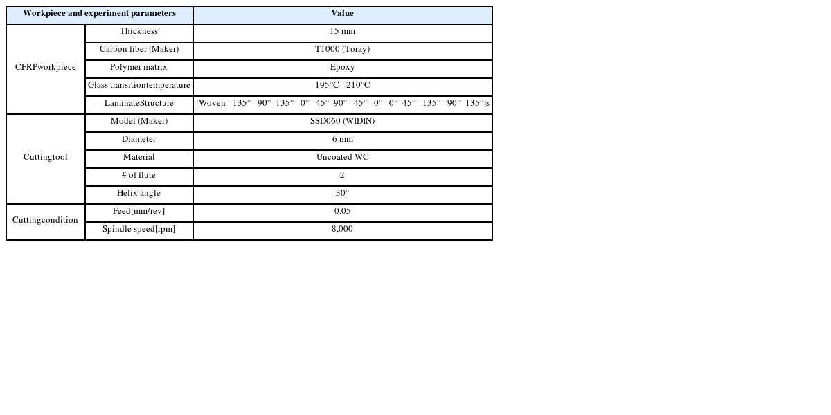본 드릴링 가공성 평가에서 사용한 공구는 Widin 사의 비코팅 초경 공구를 사용하였으며, 주축회전수는 8,000 rpm, 이송속도는 0.05 mm/rev를 사용하였다. 실험에 사용된 탄소섬유복합재의 종류와 가공조건은
