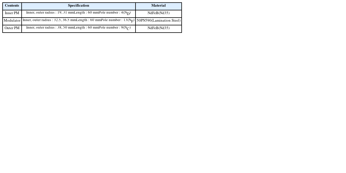 Fig. 1에서 내측 PM, HM, 외측 PM을 각각 하첨자 D, F, C로 설정하고 N을 각 요소의 극수(Pole Number)라 할 때