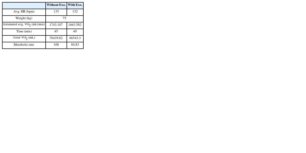 식(4)를 적용하여 산소소모량으로 변환한 후 착용로봇 미착용(Without) 상태 대비 착용(With) 상태의 운동대사량 비교를 통해 착용로봇의 성능지표로 활용할 수 있다. 운동부하 및 시간을 조절하기 힘든 계단오르기, 경사로 등반 등은 외부 환경과 동일한 방법으로 측정 및 평가한다.