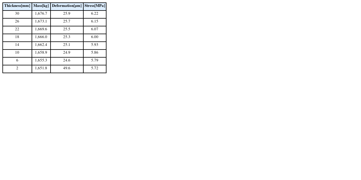 Table 3에는 각 두께에 따른 해석결과를 최대 변위와 최대 응력, 무게로 나타내고,