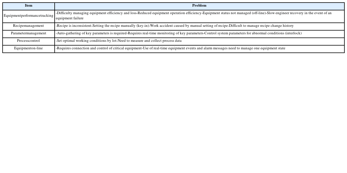 -Difficulty managing equipment efficiency and loss -Reduced equipment operation efficiency -Equipment status not managed (off-line) -Slow engineer recovery in the event of an equipment failure |