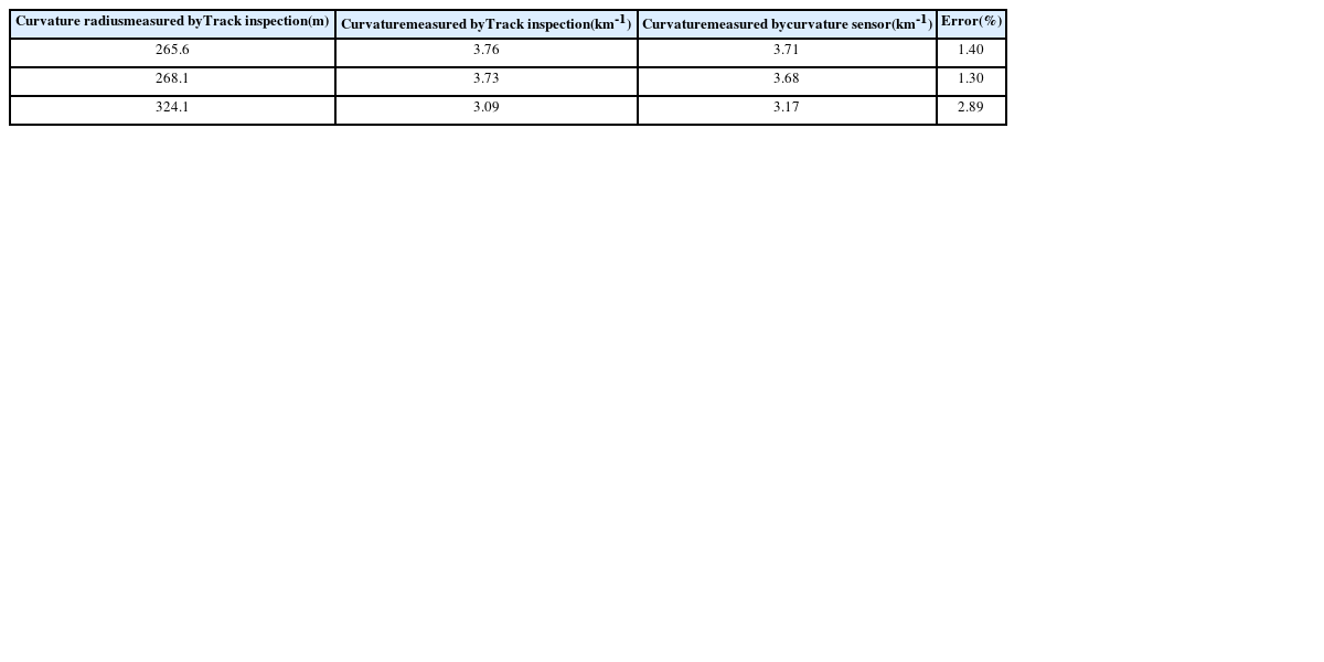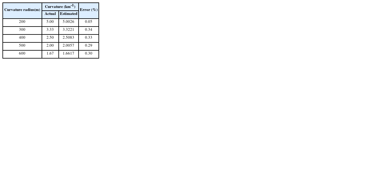 (3-3)과 같은 실제 센서 장착 상태를 고려한 계산치의 오차가 더 증대된다. 이에 따라 곡률센서의 변위가 큰 급곡선에서 최대 1.48%에 달하는 오차를 볼 수 있으며, 이 값은 선로가 직선에 가까울수록 감소한다. 그러나 이러한 오차 수준 또한 곡률센서 측정 목표인 곡률반경 600 m 이하에서는 능동조향 제어 목표에 대비하여 매우 낮은 수준임을 보여준다.