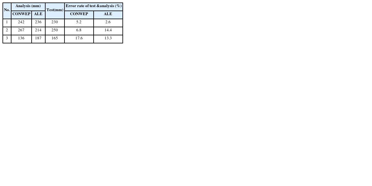 둘째, 개념모델 해석결과로 부터 시험결과 대비 주요 위치별 5.2 - 17.6% (CONWEP), 2.6 - 14.4% (ALE) 오차율이 발생하였으며, 위치별 최대 18% 내외의 수직 변형 경향성 확인을 통해서 해석모델의 신뢰성을 확인할 수 있었다.